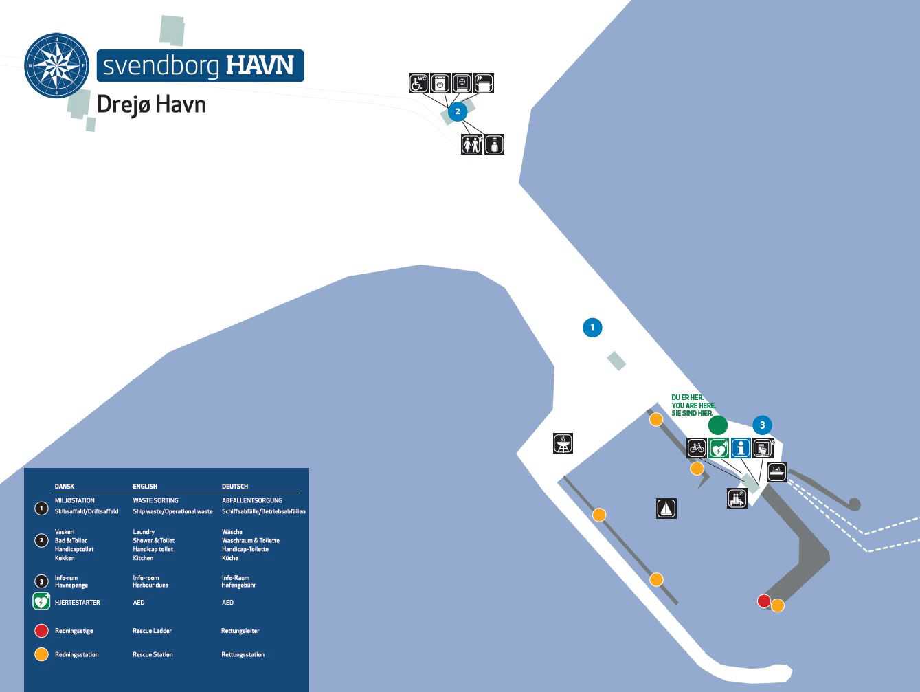 Det viste kort er en mini-udgave af det kort der vil være at finde ved selve havnen, og som viser placering af nødvendige faciliteter, herunder også affaldsordninger.