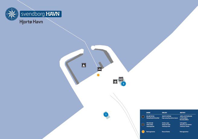 Det viste kort er en mini-udgave af det kort der vil være at finde ved selve havnen, og som viser placering af nødvendige faciliteter, herunder også affaldsordninger.