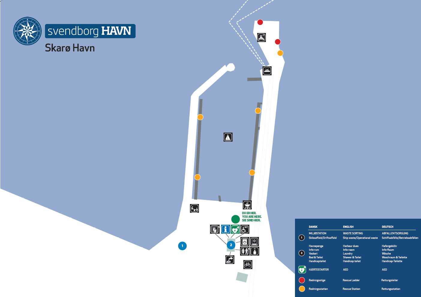 Det viste kort er en mini-udgave af det kort der vil være at finde ved selve havnen, og som viser placering af nødvendige faciliteter, herunder også affaldsordninger.