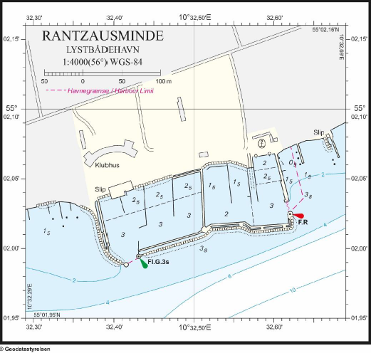 2) 55°02,036’N - 010°32,637’E, 3) 55°02,073’N - 010°32,621’E, kyst - Dette ordensreglement er ikke til hinder for, at Rantzausminde Lystbådehavn i forretningsbetingelser, takst-blade, vedtægter eller lign. fastsætter regler for betaling og vilkår for benyttelse mv. inden for havnens sø- og landområde, eksempelvis for så vidt angår gæstende fartøjer og miljøbeskyttelsesforhold